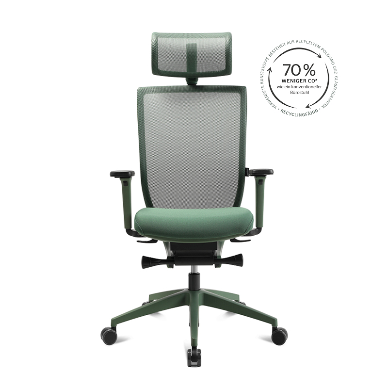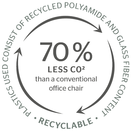 The plastics used consist of post-consumer recycled polyamide and glass fiber and can also be recycled again at the end of their life cycle. The carbon footprint is reduced by up to 70% compared to a conventional office chair.